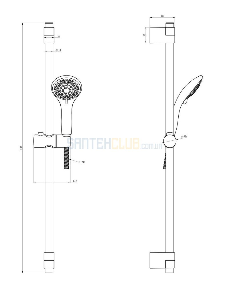 Штанга душевая (чёрная/хром) L-78 см, ручной душ (чёрный) 3 режима, шланг, блистер Высота: 780 мм; диаметр: 25 мм, материал: латунь; поверхность: черная эмалированная, лейка диаметр: 90 мм, 3 функции: ливень, массаж, туман, шланг гибкий двойное обплетение, длина 150 см